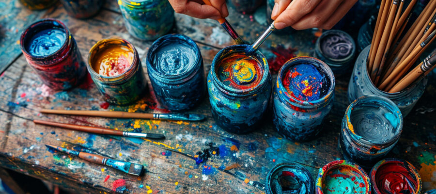 One of the most common methods to decorate glass objects is the glass paint. There are many types of specific glass paintings, ranging from opaque transparent, metallic or even fluorescent paintings. To make this technique successfully, carefully clean the glass jar before applying the paint according to the product instructions.